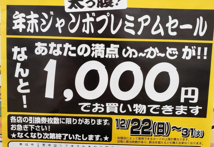 2019.12.10 ゆーしーる「年末ジャンボプレミアムセール」開催! 期間内の満点カードが通常500円のところ、なんと1,000円でご利用いただけます! 期間:令和元年12月22日(金)~31日(火) ※引換券無くなり次第終了となります。